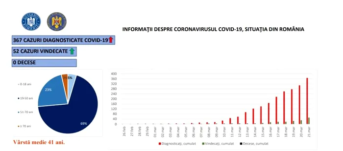 „Până astăzi, 21 martie, pe teritoriul României, au fost confirmate 367 de cazuri de persoane infectate cu virusul COVID – 19 (coronavirus). Dintre cele 367 de persoane confirmate pozitiv, 52 au fost declarate vindecate și externate (36 la Timișoara, 11 la București, 3 la Craiova, unul la Constanța și unul la Iași).
