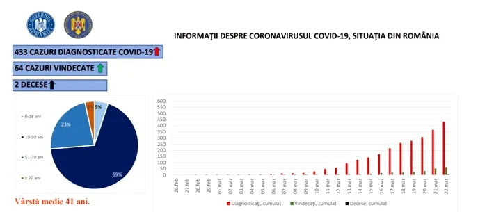 „Până în acest moment, pe teritoriul României, au fost confirmate 433 de cazuri de persoane infectate cu virusul COVID – 19 (coronavirus). Dintre cele 433 de persoane confirmate pozitiv, 64 au fost declarate vindecate și externate (47 la Timișoara, 11 la București, 3 la Craiova, 2 la Constanța și 1 la Iași).