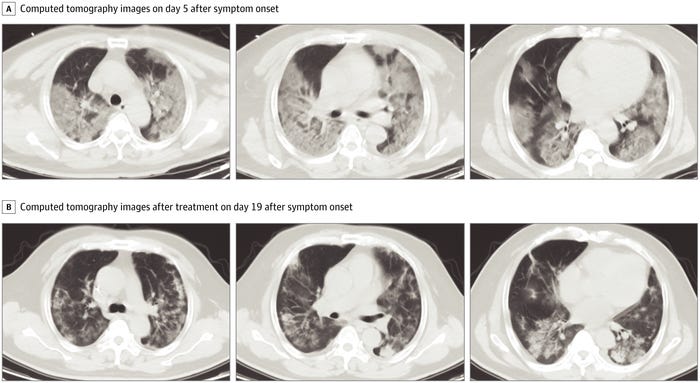 Printre studii se numără o lucrare publicată în revista RSNA Radiology: Cardiothoracic Imaging care descrie cazul unui bărbat de 44 de ani, membru al personalului de transport de la piața de fructe de mare Huanan din Wuhan, China.