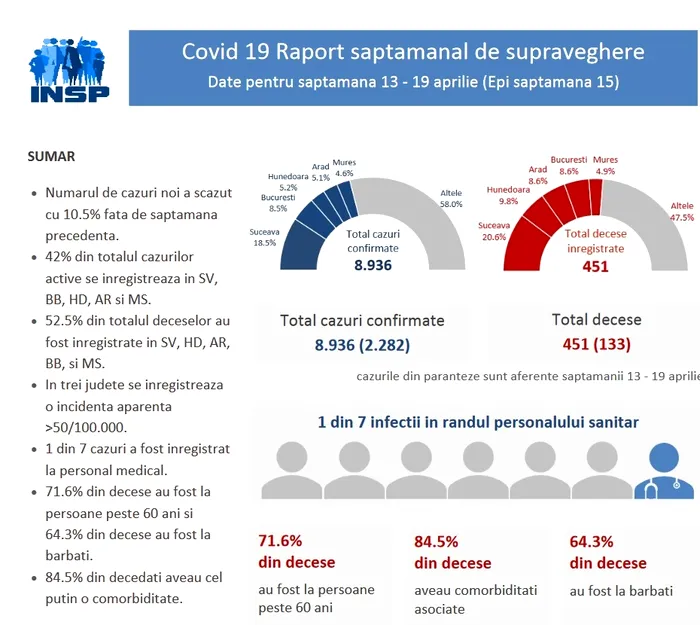 În raportul publicat pe site-ul oficial, INSP mai arată că 1 din 7 cazuri a fost înregistrat la personalul medical. Totodată, 71,6% dintre decese au fost la persoane peste 60 ani şi 64,3% – la bărbaţi.