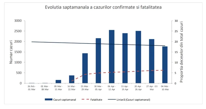 În săptămâna 4 – 10 mai, numărul cazurilor de infecție cu CARS-Cov-2 a fost sub 2.000, nivel înregistrat ultima oară în săptămâna 23 – 29 martie.