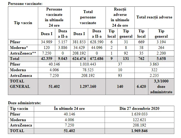 Un număr de 42.359 de persoane au primit prima doză de vaccin, iar 9.043 pe cea de-a doua doză. În ultimele 24 de ore au fost raportate 149 reacții adverse, 37 după vaccinul Pfizer, 10 după Moderna și 93 după AstraZeneca.