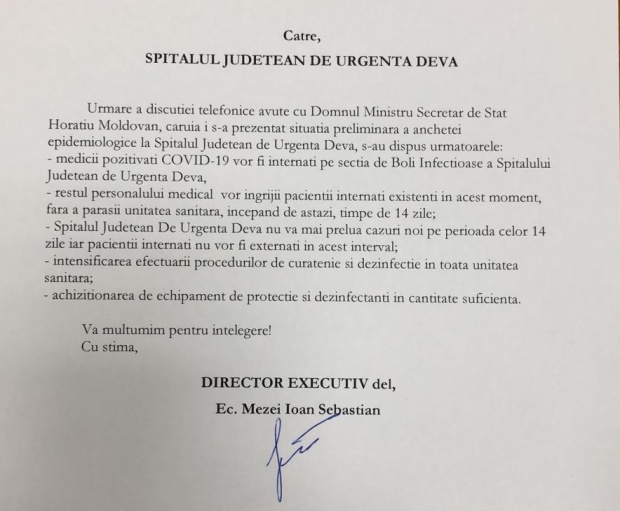 „Urmare a discuției telefonice avute cu domnul ministru secretar de stat Horațiu Moldovan, căruia i s-a prezentat situația preliminară a anchetei epidemiologice la Spitalul Județean de Urgență Deva, s-au dispus următoarele: