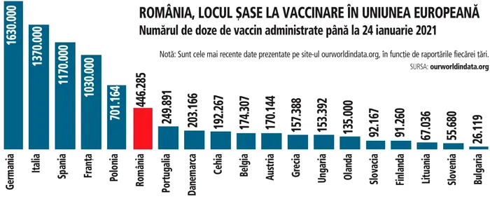 Numărul de doze de vaccin anti-COVID-19 administrate în ROMÂNIA din 27 decembrie 2020 și până în prezent plasează țara noastră pe locul al ȘASELEA în UE, după Germania, Italia, Spania, Franţa şi Polonia.