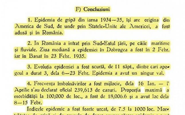 „Epidemia de gripă din România din iarna 1934 – 1935, cea mai gravă după cea din 1918, pentru care însă nu există cifre precise, a cuprins întreaga ţară într-o săptămână. A durat 4 luni, a îmbolnăvit aproape 240.000 de români şi a omorât peste 46.000, în special copii şi tineri, mai mult bărbaţi decât femei şi într-o proporţie mai mare în mediul rural decât în cel urban”, afirmă istoricul Adrian Cioflâncă pentru adevărul.ro.
