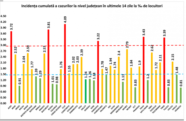 Coeficientul infectărilor cumulate la 14 zile, raportate la 1.000 de locuitori, calculat de către Direcțiile de Sănătate Publică, la nivelul Municipiului București și al județelor este următorul: