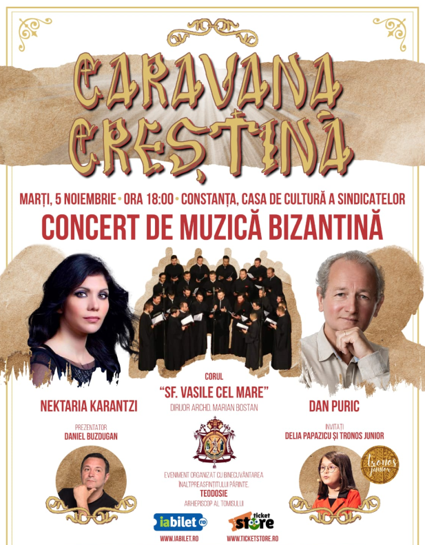 Cu o tradiție vie de mai bine de 1000 de ani, muzica bizantină este o rugăciune care are o lucrare minunată, aceea de de ai face pe cei care o ascultă să trăiască o pregustare a raiului pe pământ. În această toamnă, muzica bizantină aprinde inima românilor creștin ortodocși, iar Caravana Creștină ajunge la Constanța, în data de 5 noiembrie, de la ora 18:00, la Casa de Cultură a Sindicatelor.