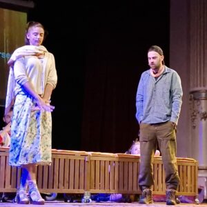 Actorii Oana Moșneagu și Denis Hanganu, în spectacolul „(Exit) Și atunci am plecat”, regia Laurențiu Rusescu