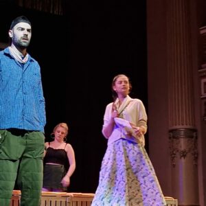 Nu am căutat special un text cu subiectul ăsta, ci pur și simplu am dat peste el. Citesc multe piese. Aici m-a atras mai întâi titlul. Se numește „Exit, Pursued by a Bear”, care este un vers dintr-o piesa a lui Shakespeare, „Poveste de iarnă”, și asta mi s-a părut interesant. Și apoi am citit un interviu al autoarei Lauren Gunderson și mi-a plăcut că și ea a plecat tocmai de la cum sună versul ăsta și s-a întrebat de ce n-a scris nimeni o piesă cu acest titlu? Și de la titlu a ajuns la poveste.