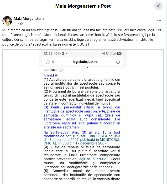 Actrița Maia Morgenstern a oferit explicații pe Facebook, referitor la postarea în care își exprimă revolta față de noua reglementare impusă de Ministerul Culturii, ce implică pontajul de opt ore pentru artiștii din teatre, opere și filarmonici. Marea artistă a ținut să sublinieze că nu solicită „încălcarea legii”, ci modificarea ei.