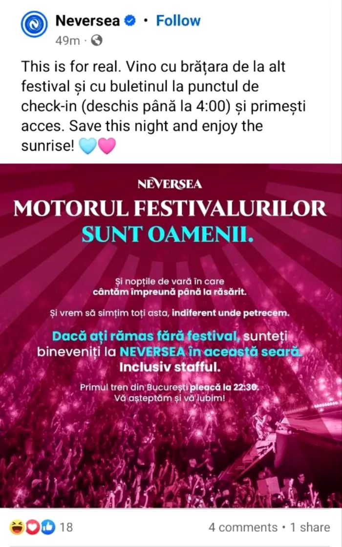 „Dacă ați rămas fără festival, sunteți bineveniți la Neversea în această seară, inclusiv stafful. Primul tren pleacă la 22:30. Vă așteptăm și vă iubim”.