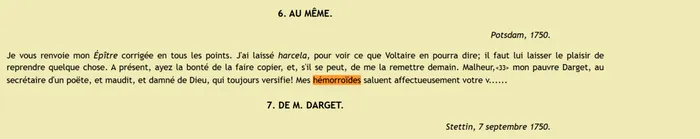 Într-o scrisoare din iulie 1750 către secretarul său, Claude Etienne Darget, i-a scris „Hemoroizii mei îți salută cu afecțiune ….”) – scrisoarea poate fi citită integral AICI.