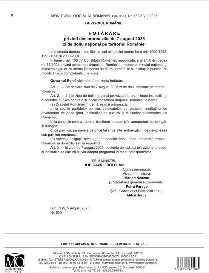 Însă, guvernul a declarat 7 august 2025 ca zi de doliu național în memoria fostului președinte Ion Iliescu, decedat în cursul zilei de 5 august 2025, la vârsta de 95 ani. Pe 7 august, de la 0ra 10:00, va începe ceremonia religioasă pentru înmormântarea fostului președinte la Cimitirul Ghencea 3, din București (vezi AICI programul funeraliilor lui Ion Iliescu).