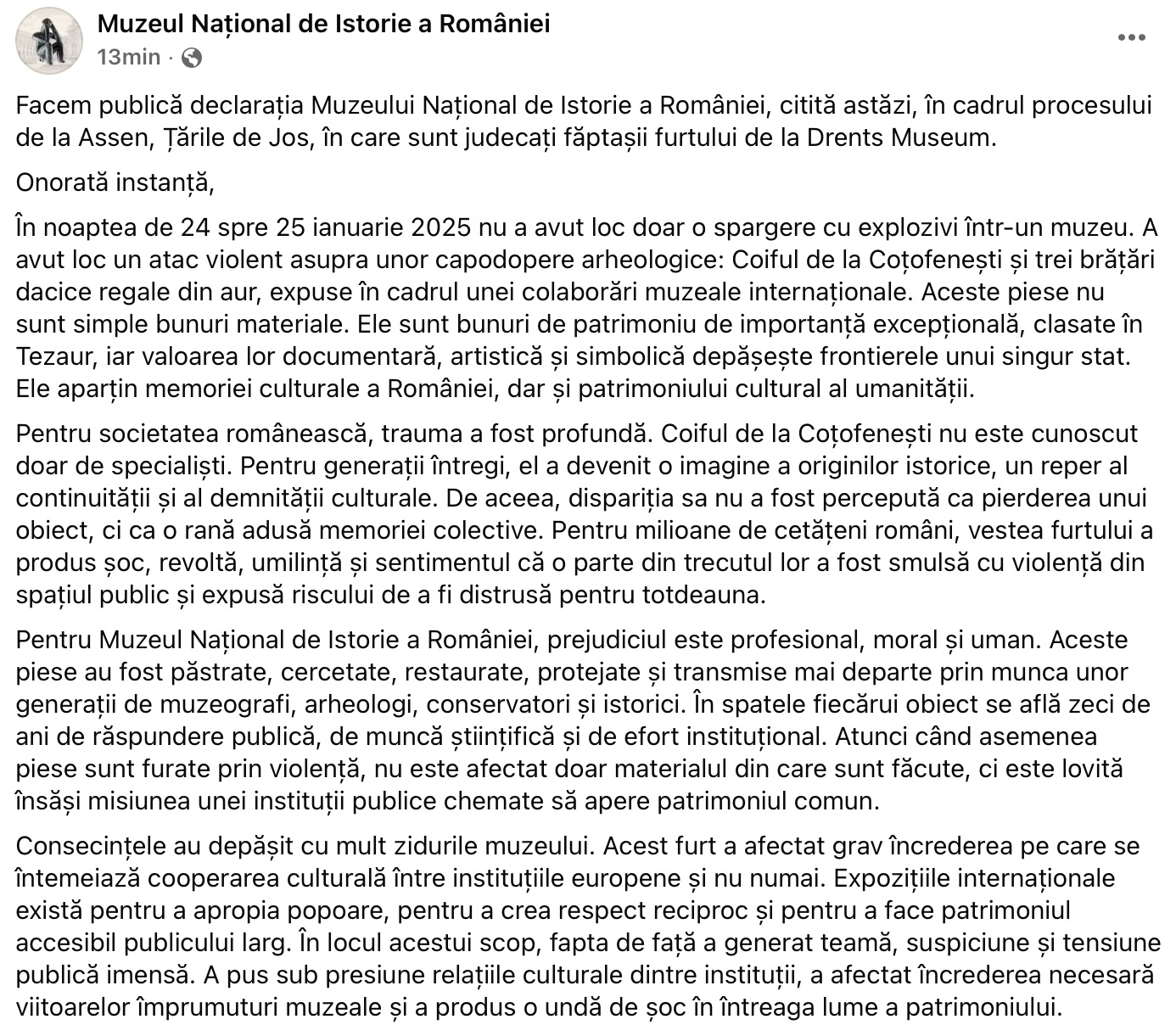 Muzeului Național de Istorie a României a făcut publică declarația citită astăzi în cadrul procesului de la Assen, Țările de Jos, în care sunt judecați făptașii furtului tezaurului dacic, de la Drents Museum.