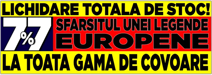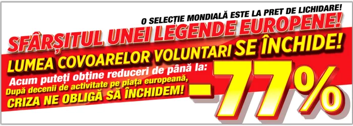 Într-un alt anunț de pe site, afaceristul de origine iraniană anunță o ”lichidare totală de stoc” și același nefericit ”sfârșit al unei legende europene”, iar reducerea de 77% este valabilă pentru ”toată gama de covoare”.