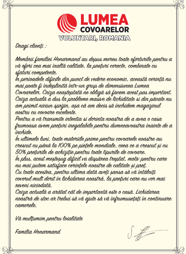 ”Dragi clienți, membrii familiei Honarmand au depus mereu toate eforturile pentru vă oferi ce mai înaltă calitate, la prețuri corecte, combinate cu sfaturi competente. În perioadele dificile din punct de vedere economic, această cerință nu mai poate fi îndeplinită într-un grup de dimensiunea Lumea Covoarelor. Criza neașteptată ne obligă să facem acest pas important. Criza actuală a dus la probleme mari de lichiditate și din păcate nu am primit niciun sprijin, așa că am decis să închidem magazinul nostru cu covoare excelente. Pentru a vă transmite intenția și dorința noastră de a avea o casă frumoasă, AVEM PREȚURI INEGALABILE PENTRU DUMNEAVOASTRĂ ÎNAINTE DE A ÎNCHIDE (n.red. – sublinierea noastră). În ultimele luni, toate materiile prime pentru covoarele noastre au crecut cu până la 100% pe piețele mondiale, ceea ce a crescut și cu 50% prețurile de achiziție pentru toate tipurile de covoare. În plus, acest meșteșug dificil va dispărea treptat, motiv pentru care nu mai putem satisface cerințele noastre de calitate și preț. CU TOATE ACESTEA, PENTRU ULTIMA DATĂ AVEȚI ȘANSA SĂ VĂ ÎNTÂLNIȚI COVORUL MULT DORIT, ÎN LICHIDAREA NOASTRĂ, LA PREȚURI CARE NU VOR MAI REVENI NICIODATĂ (n.red. – sublinierea noastră, ”fabuloasele reduceri” fiind aduse, din nou, precum o picătură chinezească, în prim-plan)”, menționează ”membrii familiei Honarmand în anunțul postat pe site.