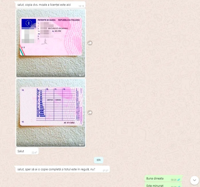 Conform promisiunii făcute – ”firmă” serioasă, nu? – clientul din România primește copia soft a permisului de conducere – ”Republica Italiană”, categoria B și, fiind întrebat dacă este în regulă, confirmă că se declară mulțumit de rezultat, iar procesul poate intra în partea finală care îl va transforma în posesor de pașaport și de permis de conducere italian. False.