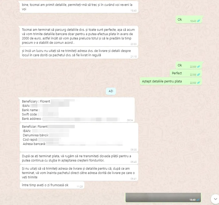 Clientul primește prin intermediul Whatsapp toate detaliile referitoare la beneficiarul plății de 2.000 de euro în avans: nume, IBAN, numele băncii, codul SWIFT, adresa băncii respective.