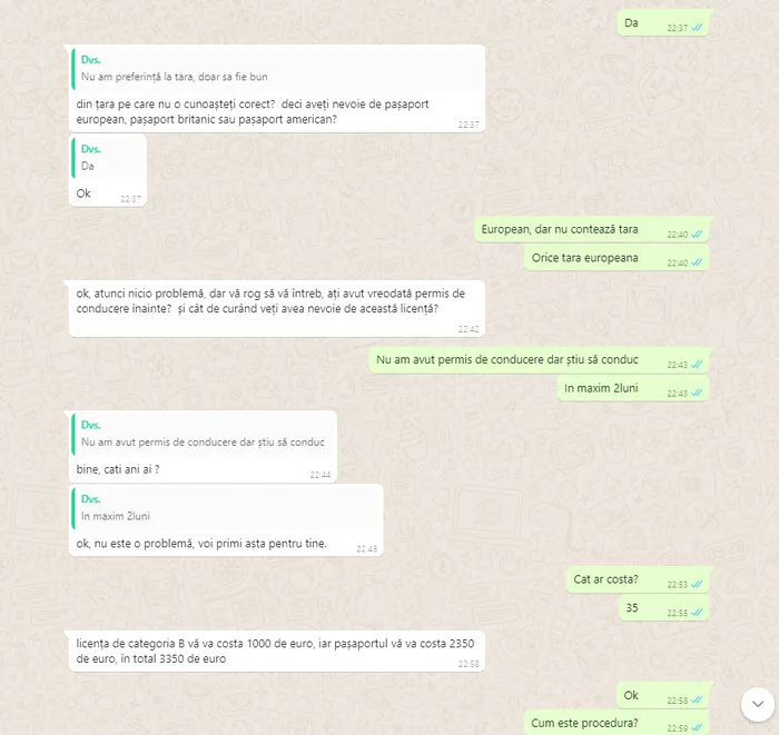 Mai mult, pentru ca informațiile să fie cât mai clare cu putință, românul doritor de acte false este informat că ”timpul de procesare” va fi de 4 săptămâni pentru ambele acte, pașaport și permis de conducere. Urmează ca a doua zi să aibă loc o altă discuție, iar viitorul cumpărător să trimită toate informațiile necesare care îi vor fi solicitate.