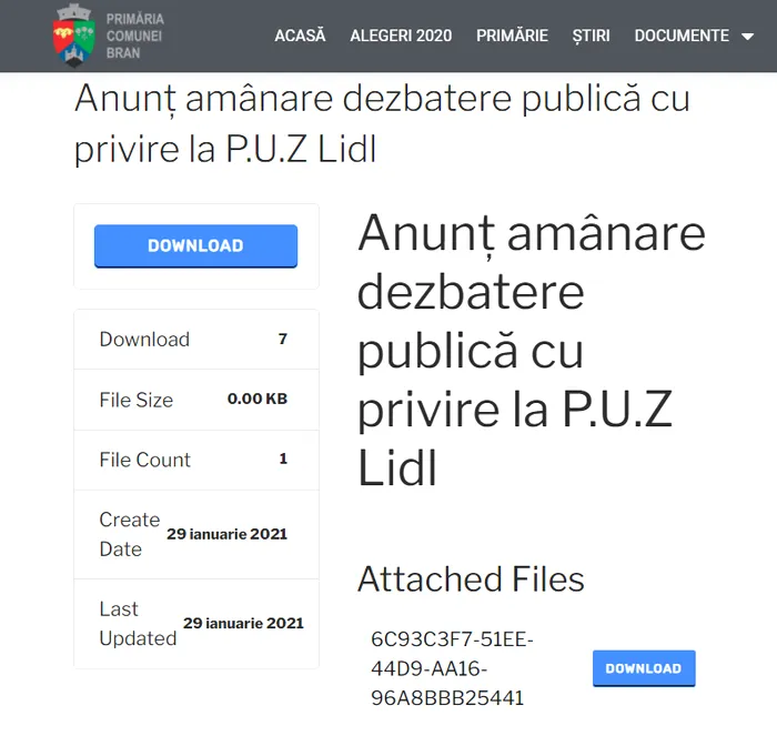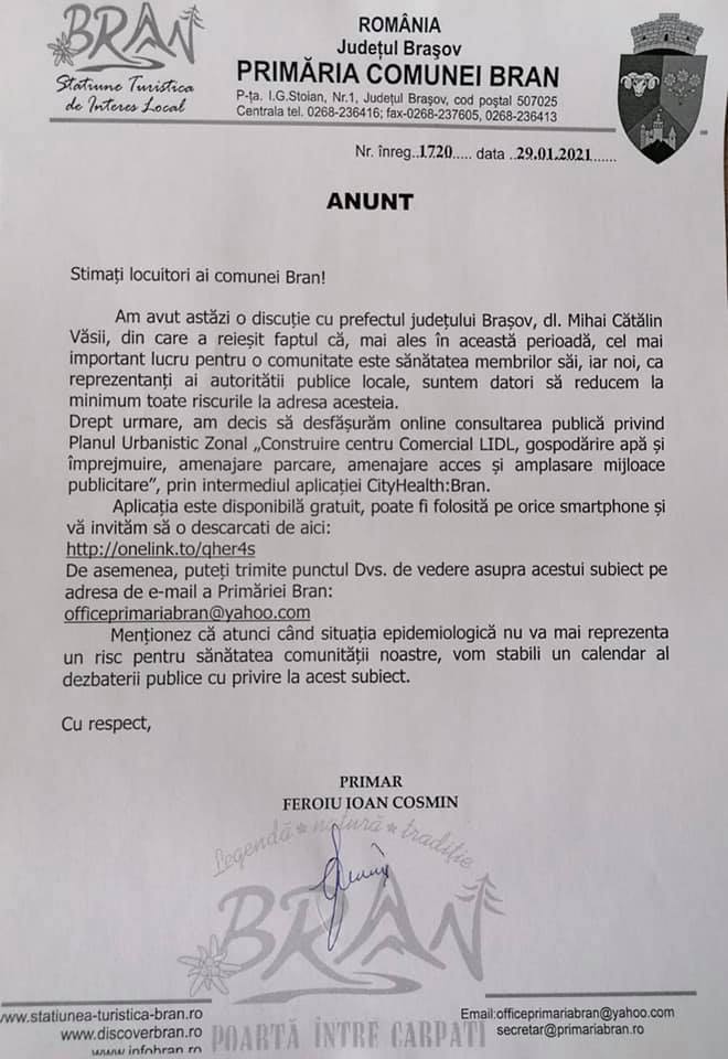 După ce GÂNDUL.RO a prezentat părerile critice ale unor locuitori ai comunei Bran, în contextul în care autoritățile locale intenționează să permită construirea unui supermarket Lidl în centrul localității, Primăria Bran a postat, chiar astăzi, un anunț prin care precizează că dezbaterea publică va fi amânată până când situația epodemiologică va permite o astfel de întâlnire.