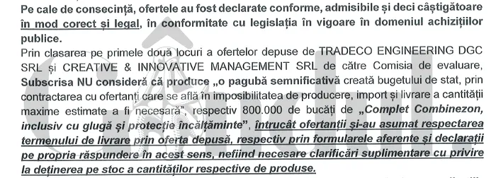 • Șase dintre cele 24 de firme invitate să participe la licitații au ajuns în etapa de negociere. Firma câștigătoare a primit maximum de puncte pentru că a dat ca termen de livrare 24 de ore, pentru combinezoane pe care le aduce din Turcia.