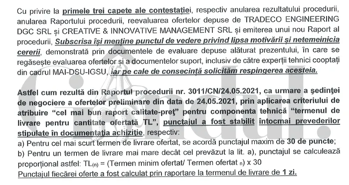 ”Faptul că acești doi ofertanți au ofertat 1 (una) zi la livrare, ca să câștige 30 de puncte (maximum acordat în cadrul procedurii pentru termenul de livrare – n.r.), nu reprezintă decât un fals în declarații, în scopul de a câștiga acest contract, precum și un abuz în serviciu din partea Comisiei de evaluare, care a achiesat la aceste falsuri, conducând la fraudarea procedurii de achiziție publică și la defavorizarea celorlalți ofertanți. Este absolut evident faptul că, în condițiile expuse anterior, ofertele depuse de către SC Tradeco Engineering DGC SRL și SC Creative & Innovative Management SRL (firmele cu cele mai mari punctaje la termenul de livrare – n.r.) nu îndeplinesc în mod corespunzător cerințele caietului de sarcini și ar fi trebuit respinse ca neconforme”, acuză reprezentanții firmei Best Achiziții SRL în contestația depusă.