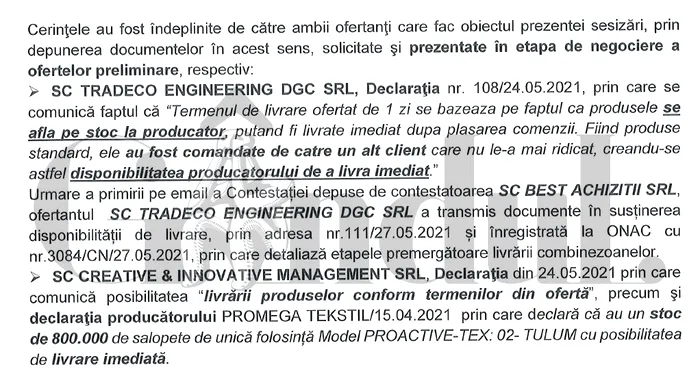 Societatea Best Achiziții SRL, firma poziționată pe locul 4 în urma acestei licitații – care a primit doar 2 puncte din partea Comisiei de evaluare de la ONAC pentru termenul de livrare al combinezoanelor, respectiv 15 zile – a făcut contestație și a solicitat anularea rezultatului procedurii de atribuire.