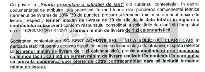 Principalele argumente ale contestației făcute de firma Best Achiziții, care a primit doar 2 puncte din maximum de 30 pentru termenul de livrare de 30 de zile oferit în cadrul licitației: