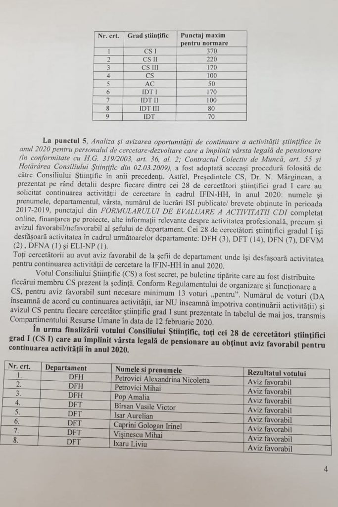 Potrivit unui document oficial obținut de GÂNDUL.RO, alți 28 de cercetărori științifici care au împlinit vârsta legală de pensionare au obținut aviz favorabil pentru continuarea activității științifice în anul 2020, doar în cazul lui Nicolae Zamfir s-a luat măsura demiterii pe acest considerent.