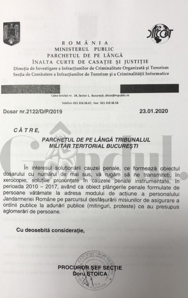 Adevărul este că procurorul Doru Stoica a făcut adrese în 23.01.2020 atât către Secția Parchetelor Militare, cât și către Parchetul Militar Teritorial București prin care a solicitat TOATE SOLUȚIILE date din 2010 până în 2017 de aceste unități de parchet pe cauze în care a fost implicată Jandarmeria sau jandarmi. Iată ce scrie în adresele înaintate de procurorul DIICOT către cele două instituții, conținutul lor fiind același: