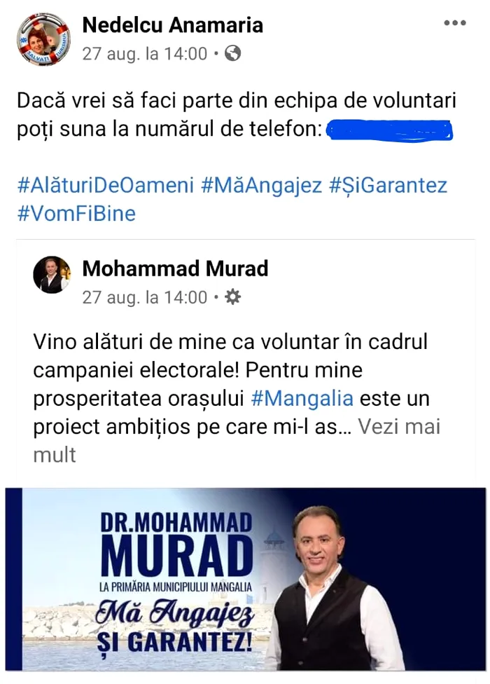 Ana Maria Nedelcu, șefa de campanie a libanezului, le cere alegătorilor să fie alături de un viitor primar ”simbol” – ”independentul” Murad – apărând alături de acesta și promovându-i postările din mediul online.