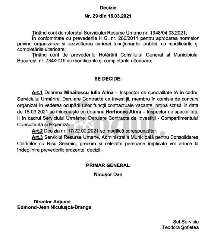 Prin Decizia nr. 29 din 16 martie 2021, ”Mihăilescu Iulia Alina — Inspector de specialitate IA în cadrul Serviciului Urmărire, Derulare Contracte de Investiții, membru în comisia de concurs organizat în vederea ocupării unor funcții contractuale vacante, proba scrisă în data de 18.03.2021 – se înlocuiește cu doamna Horhocea Alina — Inspector de specialitate II în cadrul Serviciului Urmărire, Derulare Contracte de Investiții – Compartimentului Consultanță și Expertiză”.