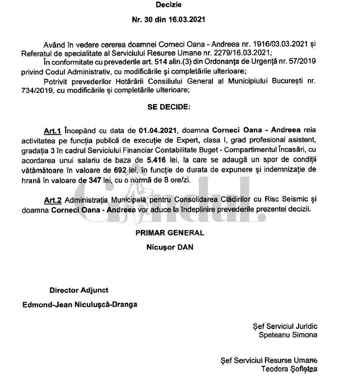 Prin Decizia nr. 30 din 16.03.2021, ”începând cu data de 01.04.2021, doamna Corneci Oana – Andreea reia activitatea pe funcția publică de execuție de Expert, clasa I, grad profesional asistent, gradația 3 in cadrul Serviciului Financiar Contabilitate Buget – Compartimentul Încasări, cu acordarea unui salariu de baza de 5.416 lei, la care se adaugă un spor de condiții vătămătoare in valoare de 692 lei, in funcție de durata de expunere și indemnizație de hrană in valoare de 347 lei, cu o normă de 8 ore/zi”.