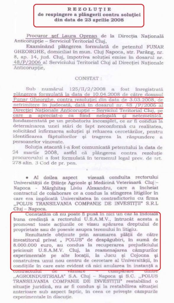Dar DNA Cluj a dispus neînceperea urmăririi penale împotriva rectorului USAMV Liviu Alexandru Mărghitaş, arătând că ”acesta a avut mandat din partea Senatului USAMV pentru a negocia cu Polus, iar cele 8 milioane de euro au ajuns în conturile universității, nu în buzunarele rectorului”. Deci, nu există nicio faptă de corupție.