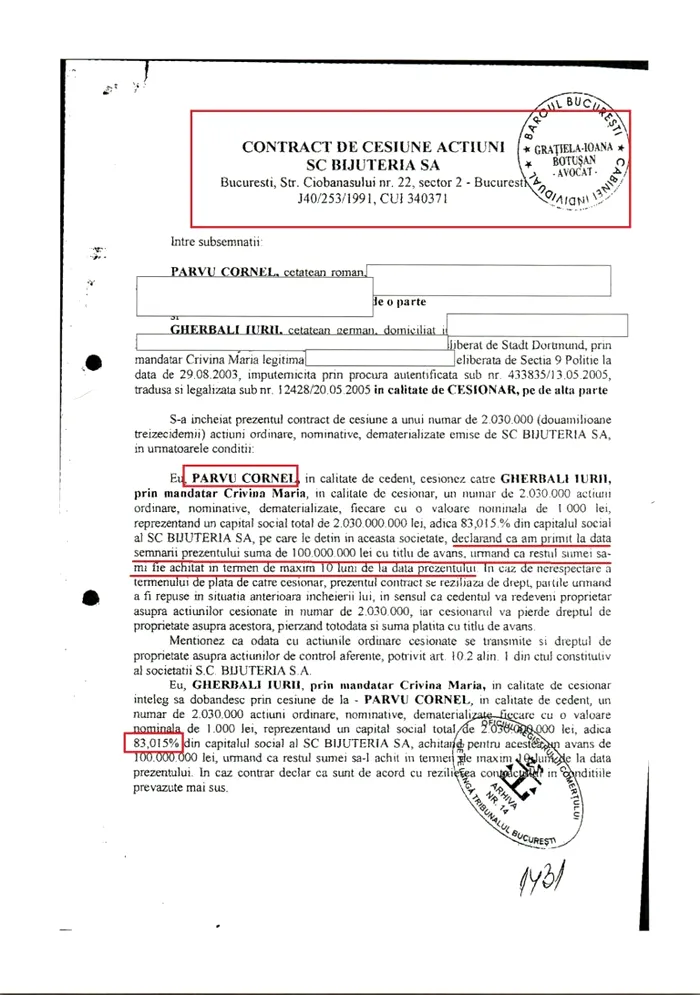 Astfel că, la data de 20.05.2005, Cornel Pârvu a cedat subit, prin contract de cesiune, un număr de 2.030.000 acțiuni Bijuteria S.A. către cetățeanul german Gherbali Iurii, medic stomatolog.