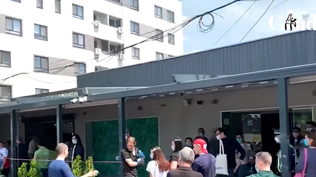 Bucureștenii care s-au pus la coadă au încercat să păstreze distanța regulamentară, dirijați de forțele de ordine, așa cum s-a întâmplat în fața terasei „La Cocoșatu”.