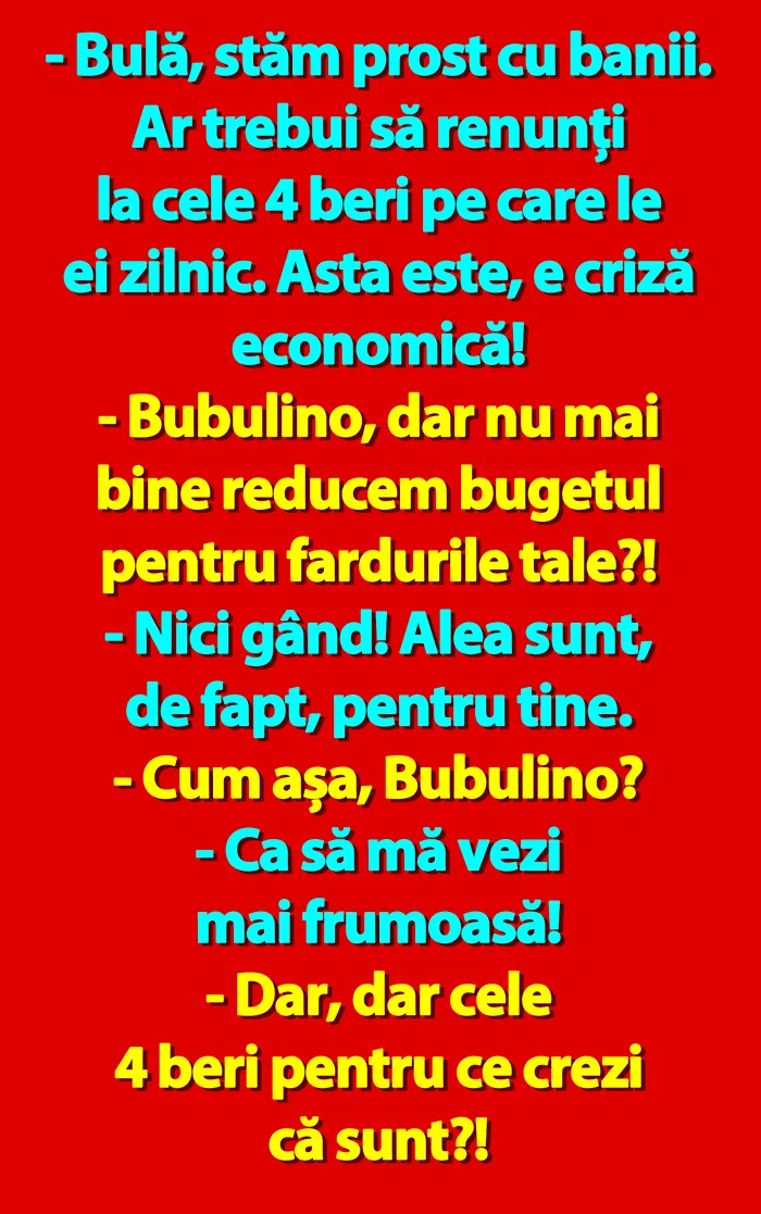 – Bulă, stăm prost cu banii. Ar trebui să renunți la cele 4 beri pe care le bei zilnic. Asta este, e criză economică!
