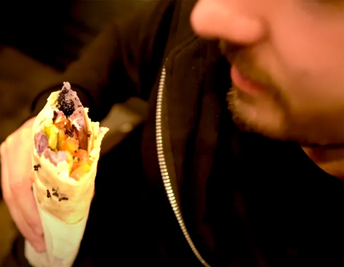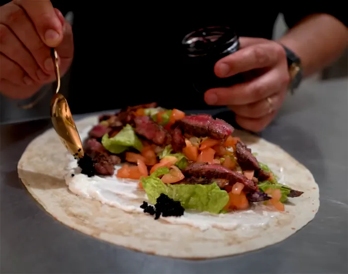 Deși nu sunt ingrediente clasice pentru o shaorma, aceasta conține, printre altele, trufe, caviar, icre de manciuria, vită angus prime, brânză cu mucegai, cartofi, roșii, salată și foiță de aur.
