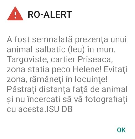 „A fost semnalată prezenţa unui animal sălbatic (leu) în municipiul Târgovişte, cartier Priseaca, zona staţia peco Helene! Evitaţi zona, rămâneţi în locuinţe! Păstraţi distanţa faţă de animal şi nu încercaţi să vă fotografiaţi cu acesta”, conform mesajului RO-ALERT transmis de ISU Dâmboviţa.