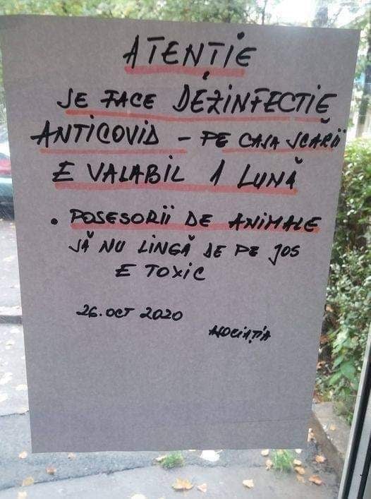 Atenție! Se face dezinfecție Anti-Covid pe casa scării. E valabil o lună. POSESORII DE ANIMALE SĂ NU LINGĂ DE PE JOS! E toxic…”