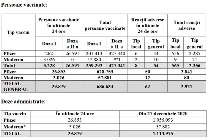 Aproape 30 de mii de persoane (29.879) au fost vaccinate în ultimele 24 de ore. Au fost înregistrate 62 de reacţii adverse, din care 50 la persoane vaccinate cu Pfizer şi 12 la persoane vaccinate cu Moderna.