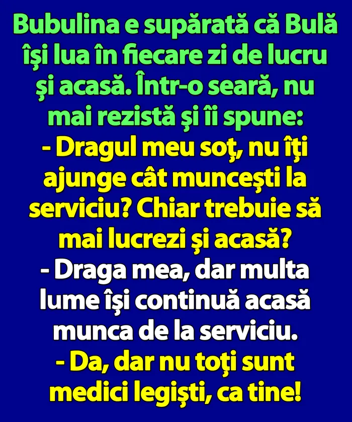 – Dragul meu soț, nu îți ajunge cât muncești la serviciu? Chiar trebuie să mai lucrezi și acasă?