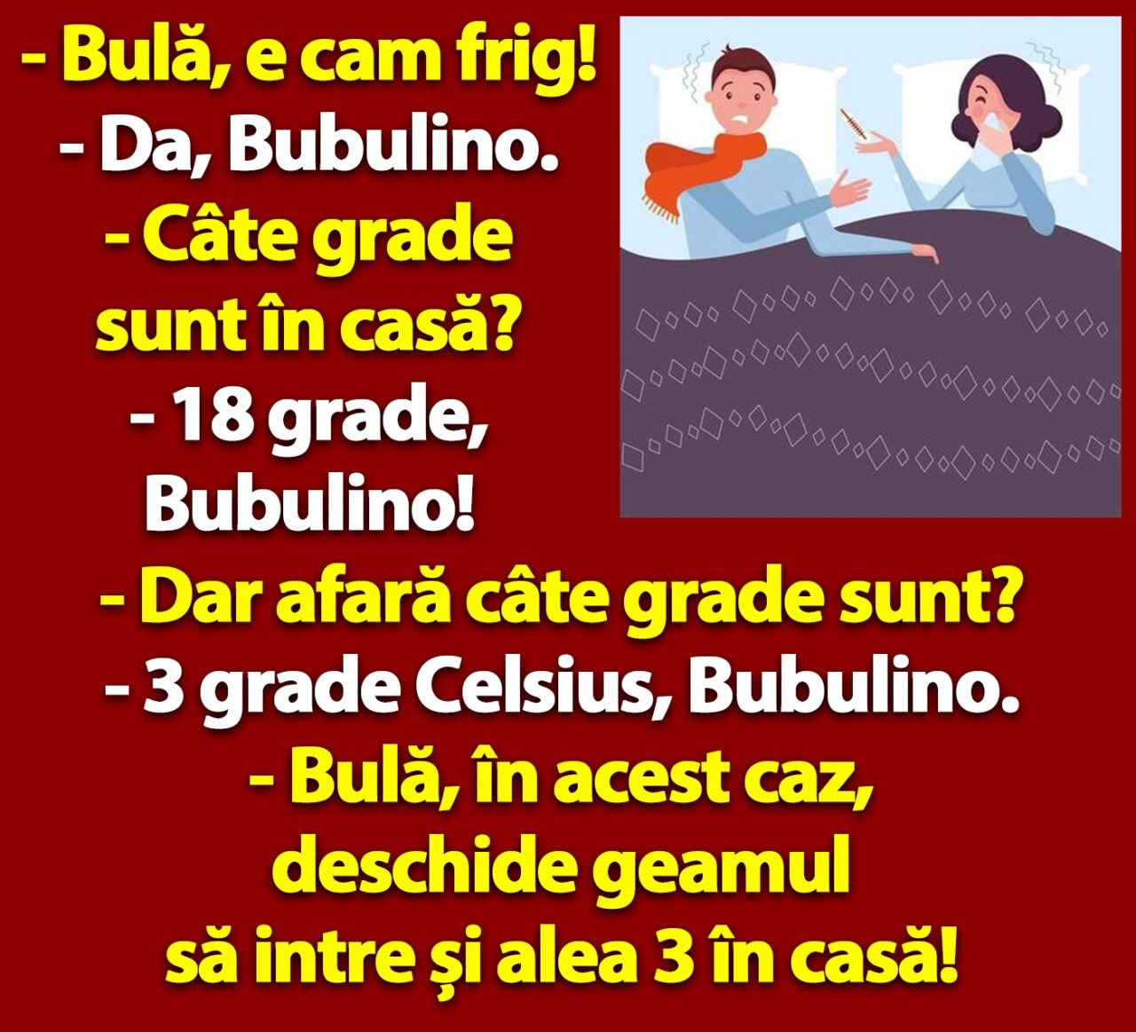 – Bulă, în acest caz, deschide geamul să intre și alea 3 în casă!