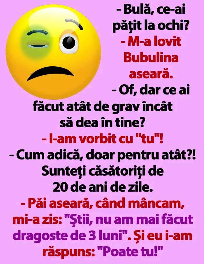 Prima pagină » Diverse » BANC | „Bulă, ce-ai pățit la ochi?”