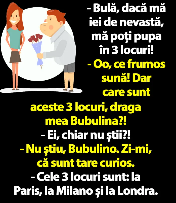 – Bulă, dacă mă iei de nevastă, mă poți pupa în 3 locuri!