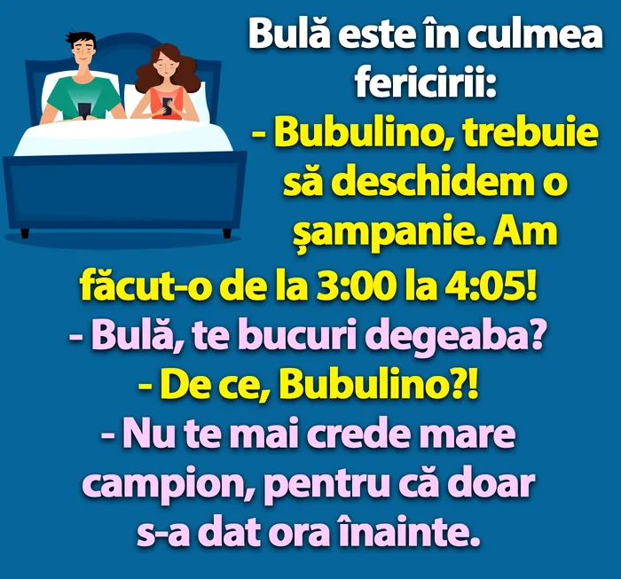 – Bubulino, trebuie să deschidem o șampanie. Am făcut-o de la 3:00 la 4:05!