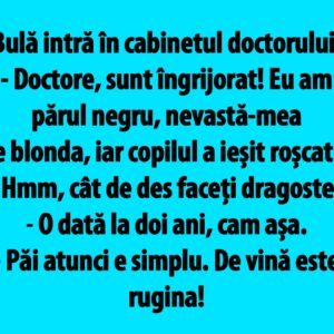 – Doctore, sunt îngrijorat! Eu am părul negru, nevastă-mea e blonda, iar copilul a ieșit roșcat