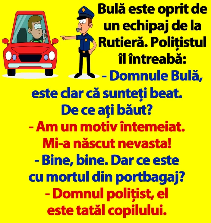 Bulă este oprit de un echipaj de la Rutieră. Polițistul îl întreabă: