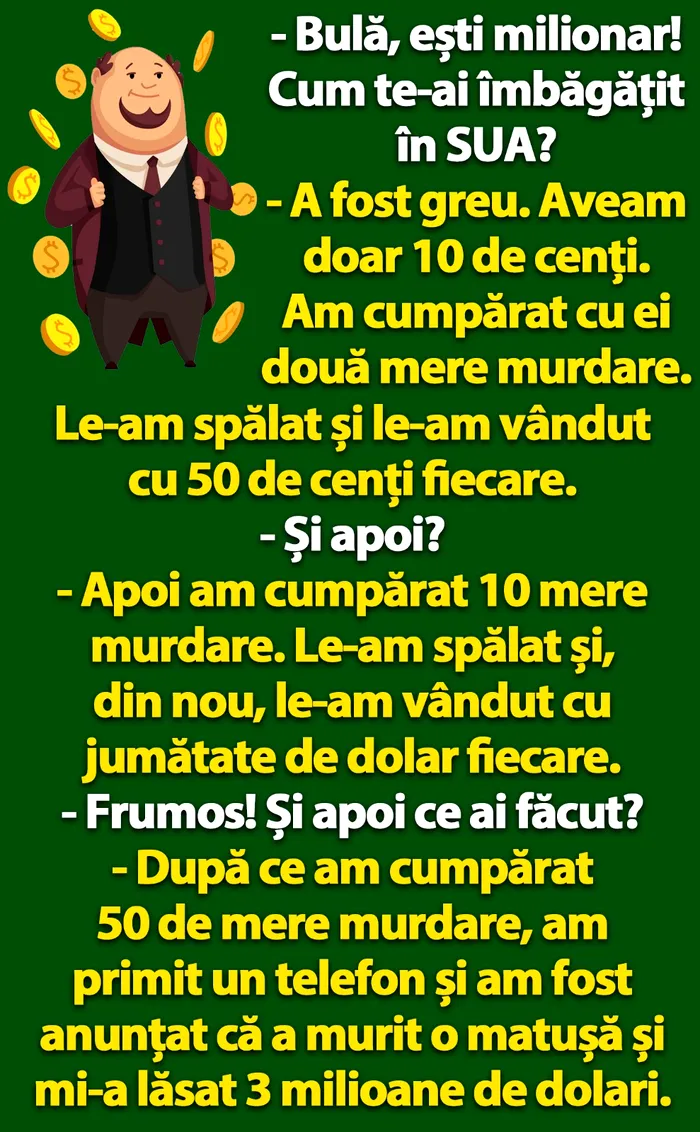 – După ce am cumpărat 50 de mere murdare, am primit un telefon și am fost anunțat că a murit o matușă și mi-a lăsat 3 milioane de dolari.