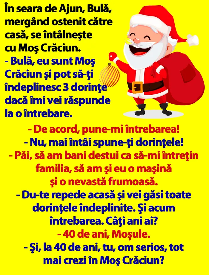 – Bulă, eu sunt Moş Crăciun şi pot să-ţi îndeplinesc 3 dorinţe dacă îmi vei răspunde la o întrebare.